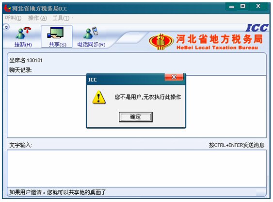 7. 遠(yuǎn)程共享:考慮到對(duì)納稅人電腦的安全保護(hù),座席端沒有權(quán)利主動(dòng)共享納稅人的桌面,即坐席不能點(diǎn)擊共享按鈕,如果點(diǎn)擊,將彈出對(duì)話框友好提示:“您不是納稅人,無權(quán)執(zhí)行此操作”如下圖: