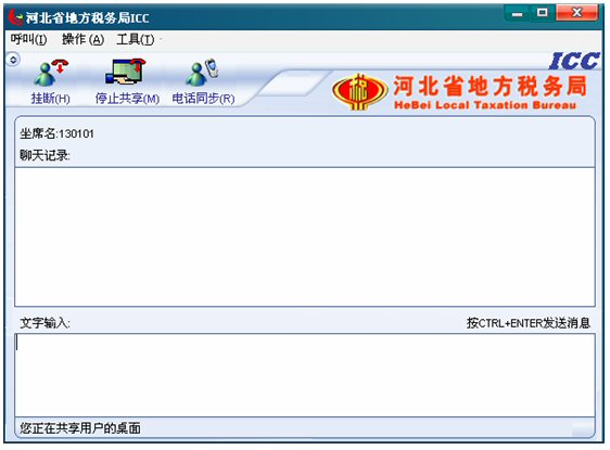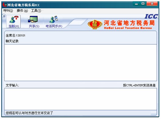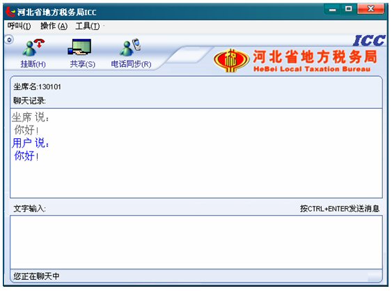 輸入文字信息后按CTRL+ENTER就可發(fā)送消息。輸入的文字可以在 ICC界面上面的聊天記錄對(duì)話框中顯示,同時(shí)發(fā)送給納稅人。如下圖:
