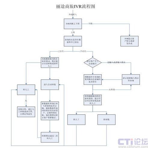 麗途商旅呼叫中心整個(gè)呼叫流程是:客戶通過(guò)全國(guó)400電話呼入系統(tǒng),IVR自動(dòng)應(yīng)答,根據(jù)客戶來(lái)電號(hào)碼通過(guò)URL的方式和業(yè)務(wù)系統(tǒng)數(shù)據(jù)庫(kù)進(jìn)行查詢?cè)搧?lái)電號(hào)碼是否是老客戶,然后直接播報(bào)客戶對(duì)應(yīng)的企業(yè)名稱和麗途的歡迎語(yǔ),客戶可以進(jìn)行訂單的審批和密碼驗(yàn)證或者轉(zhuǎn)人工服務(wù);如果是來(lái)電號(hào)碼在數(shù)據(jù)庫(kù)中不存在,IVR系統(tǒng)提示客戶輸入企業(yè)編號(hào)或者轉(zhuǎn)接人工服務(wù),輸入企業(yè)編號(hào)還會(huì)在數(shù)據(jù)庫(kù)中查詢是否是已存在客戶并執(zhí)行相應(yīng)的流程,如是新客戶那么就會(huì)轉(zhuǎn)接人工服務(wù),由人工來(lái)進(jìn)行訂單的制定、審批,密碼驗(yàn)證等工作。