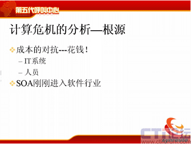 我分析一下計算的危機,計算危機來源于三個方面,第一是客戶面對不斷提升的服務水平,現(xiàn)在需要新的通信方式,包括電話、傳真、短信、電子郵件等等,還包括網(wǎng)上的護航瀏覽,表單共享,電子排版等等通信方式。第二方面需要更快的服務時間,80%的電話是20秒接起,可是短信的響應時間為什么這么長,需要更準確的服務,電話的服務是什么樣的,我現(xiàn)在需要網(wǎng)上交談的服務質(zhì)量也能夠得到保障等等,這是客戶對IT服務者提供的壓力。