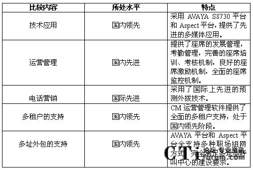 綜合比較,深圳電信商業(yè)呼叫中心的建設(shè)處于國(guó)內(nèi)領(lǐng)先階段,有些技術(shù)甚至處于國(guó)際先進(jìn)的水平。比較如下: