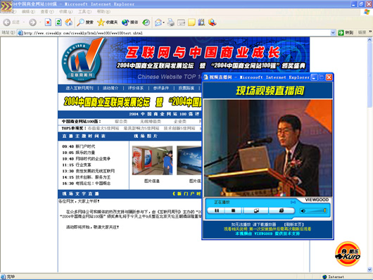 作為此次活動(dòng)全程流媒體直播技術(shù)提供商VIEWGOOD(www.viewgood.com)商務(wù)主管在活動(dòng)現(xiàn)場說:“中國大陸的上網(wǎng)用戶總?cè)藬?shù)即將突破1億,中外商業(yè)網(wǎng)站的資本運(yùn)作空前活躍,3G、IPv6等新技術(shù)將催生互聯(lián)網(wǎng)的新一輪變革,網(wǎng)絡(luò)媒體正在從“第四媒體”快速走向“第一媒體”,致力為中國互聯(lián)網(wǎng)媒體服務(wù)的VIEWGOOD和所有的網(wǎng)站一樣,既面臨著激烈的挑戰(zhàn),更面臨著難得的發(fā)展機(jī)遇。無論是成長最快的網(wǎng)站、最具潛力的網(wǎng)站,還是創(chuàng)新最佳的網(wǎng)站,都是VIEWGOOD的合作伙伴。我們將以國際最先進(jìn)的流媒體技術(shù)服務(wù)于中國互聯(lián)網(wǎng)。”