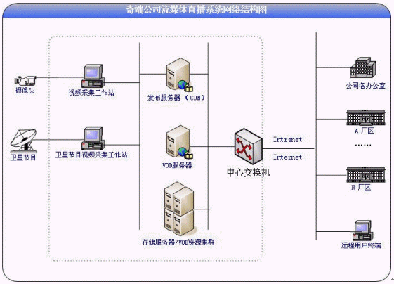 用于奇瑞公司的視頻直播系統(tǒng),是典型的基于以太網(wǎng)的網(wǎng)絡視頻直播應用。奇瑞公司對該系統(tǒng)的用途較為重要,因此,視頻直播時,對聲音畫面的同步性要求更為嚴格,畫面和聲音的延時,將使得培訓人員容易有反感情緒,因此系統(tǒng)的處理能力十分重要,同時,考慮到今后培訓人員的數(shù)量,有可能會超過一般的直播人數(shù),也為了提高培訓的效率,直播系統(tǒng)的并發(fā)量需要達到1000人以上。還要求系統(tǒng)平臺的在線可擴展能力強、技術實現(xiàn)上具有一定的先進性。