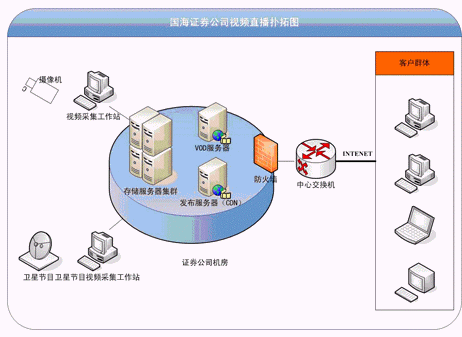 在同時對于局域網(wǎng)、廣域網(wǎng)進行多路直播,采用一臺發(fā)布服務器就可以順利的完成發(fā)布工作了,由于公司方面對于系統(tǒng)錄制節(jié)目的要求,所以要有一臺服務器專們用來采集和存貯節(jié)目,在直播系統(tǒng)上, VIEWGOOD結合了自身的產(chǎn)品特點,WebLIVE直播系統(tǒng)加強了采集、錄制與直播分離的優(yōu)勢,采用了標準備的B/S架構,完全基于Web方式,可完全運行于 Internet。在編碼技術上采用了最先進的MPEG-4編解碼技術,既保證了圖像的質(zhì)量,又大大縮減了視頻所占的帶寬,使得直播平臺更加的穩(wěn)定和高效。