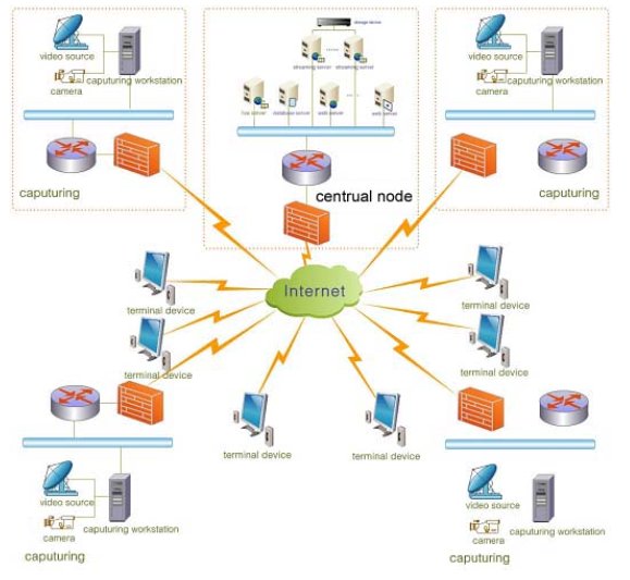 各單位內(nèi)部發(fā)部是通過組播實(shí)現(xiàn),同一網(wǎng)段進(jìn)行一路信號(hào)的組播。并上傳一路至總部的總中心機(jī)房,不同單位的用戶可以局域內(nèi)觀看。每個(gè)單位中心機(jī)房有自己內(nèi)部的視頻點(diǎn)播服務(wù)器,利用該系統(tǒng)各單位將所有的資料放置在網(wǎng)上,供其它部門的指戰(zhàn)員進(jìn)行點(diǎn)播。