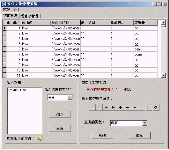 本軟件專門設(shè)計用來管理彩話系統(tǒng)中的音樂文件?捎迷撥浖M(jìn)行歌曲的管理,包括插入,查詢,修改,刪除等操作。