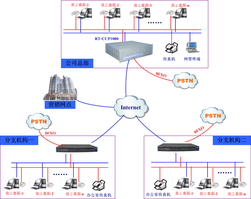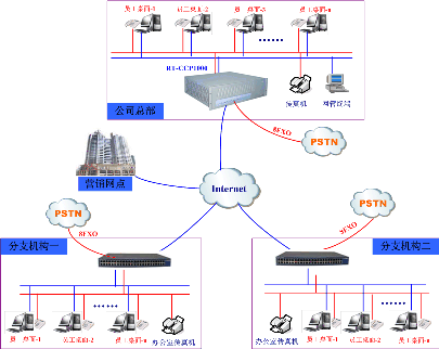 生產(chǎn)總部與分支機(jī)構(gòu)、營銷網(wǎng)點(diǎn)實(shí)現(xiàn)統(tǒng)一辦公電話功能(即VOIP組網(wǎng)+辦公電話功能)。