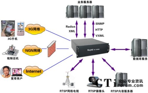 接入部分由視頻網(wǎng)關(guān)(VIG)組成,完成綜合媒體平臺與3G網(wǎng)絡(luò)的互連。通過E1或PRI與TD-SCDMA的移動交換機MSC相連接,通過以太網(wǎng)口與IP網(wǎng)絡(luò)相連接,利用協(xié)議轉(zhuǎn)換器實現(xiàn)3G網(wǎng)絡(luò)與IP的對接。從而提供3G用戶、SIP用戶、H.323用戶或其他用戶訪問視訊業(yè)務(wù)。接入部分保證了視訊平臺與移動網(wǎng)絡(luò)的順利接入以及與其 他媒體無縫連接。