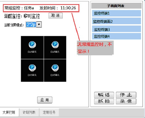 監(jiān)控計(jì)劃規(guī)定了監(jiān)控系統(tǒng)何時(shí)以何種方式在大屏上顯示多個(gè)現(xiàn)場(chǎng)的監(jiān)控畫(huà)面。監(jiān)控畫(huà)面可輪詢(xún),可調(diào)整設(shè)置畫(huà)面分屏顯示模式;可以固定在某位置顯示某監(jiān)控畫(huà)面;可以切換到險(xiǎn)情聯(lián)動(dòng)監(jiān)控模式?梢耘c監(jiān)控畫(huà)面喊話(huà);監(jiān)控錄像;保存畫(huà)面等功能。