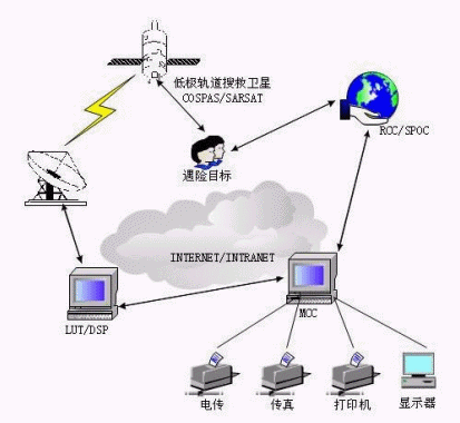 當(dāng)用戶(船舶、飛機(jī)或個(gè)人)遇險(xiǎn)后,遇險(xiǎn)示位信標(biāo)可以通過人工或者自動(dòng)由遇險(xiǎn)時(shí)的撞擊、水浸而激活(信標(biāo)激活后可以存活48/小時(shí)),發(fā)出121.5MHz/243MHz/4O6MHz的遇險(xiǎn)報(bào)警信號(hào),搜救衛(wèi)星則對(duì)遇險(xiǎn)示位信標(biāo)發(fā)出的遇險(xiǎn)報(bào)警信號(hào)進(jìn)行變頻、存儲(chǔ)、轉(zhuǎn)發(fā)等處理并轉(zhuǎn)發(fā),由幾個(gè)數(shù)據(jù)信號(hào)處理器(DSP)對(duì)衛(wèi)星的下行信號(hào)中的121.5MHz、243MHz、406MHz信號(hào)進(jìn)行實(shí)時(shí)處理或?qū)?06MHz信號(hào)進(jìn)行延時(shí)處理。由遍布全球的地面處理分系統(tǒng)本地用戶終端(LUT)接收并計(jì)算出遇險(xiǎn)目標(biāo)的位置,把信標(biāo)的報(bào)警數(shù)據(jù)和統(tǒng)計(jì)信息送給相應(yīng)的搜救任務(wù)控制中心(MCC)。