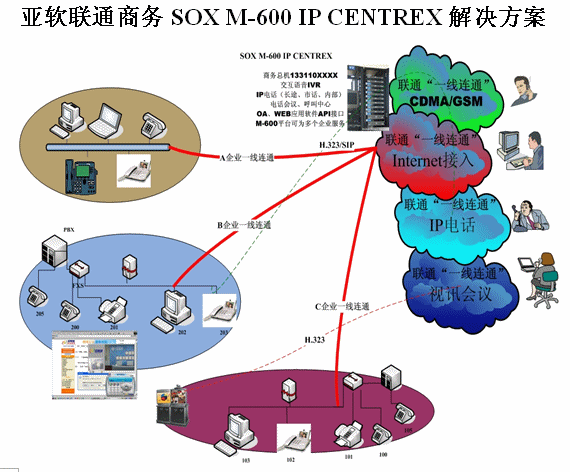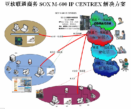 亞軟SOX融合通信解決方案也叫聯(lián)通商務(wù)解決方案,該方案是基于軟交換的可為多個(gè)集團(tuán)用戶提供IP語音解決方案。SOX融合通信解決方案為集群用戶提供了區(qū)別于傳統(tǒng)集團(tuán)內(nèi)部、外部的通信方式,集團(tuán)無需再購置PBX及為其支付維護(hù)費(fèi)用。由于SOX融合通信解決方案是置于IDC托管中心并基于IP軟交換技術(shù),所以沒有地域限制,具有集群性、可移動(dòng)性等IP通信特征。