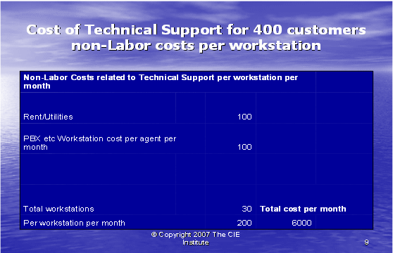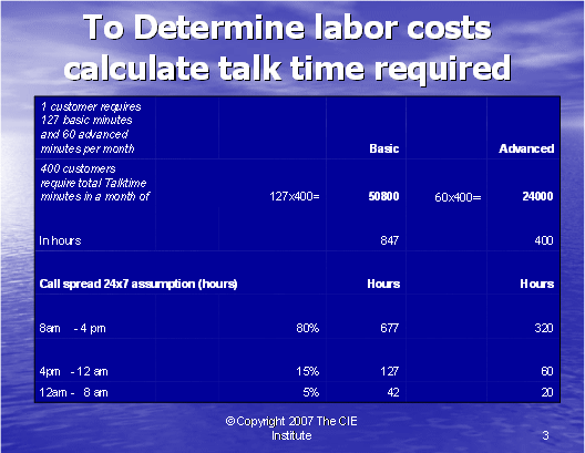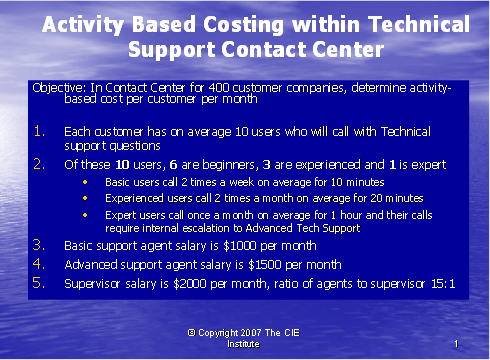 我們將舉例說(shuō)明我們?nèi)绾螢橐粋(gè)呼叫中心使用行動(dòng)成本法,以確定服務(wù)一個(gè)客戶所花費(fèi)的成本。我們將在一個(gè)技術(shù)支持呼叫中心中舉例。在這樣一種呼叫中心中,座席員為帶著問(wèn)題呼入的客戶提供技術(shù)協(xié)助。查明服務(wù)一個(gè)客戶所花費(fèi)的成本的一個(gè)主要的原因是懂得如何為技術(shù)支持定價(jià),以至于我們知道如何為了贏利去收費(fèi)。如果我們精確地了解對(duì)每個(gè)客戶上所花費(fèi)的成本,我們的定價(jià)策略就不用再依賴于猜測(cè)工作。