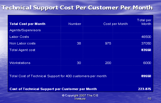最后,我們可以如同下面圖表10所示,把所有的信息放在一起。每個(gè)客戶的技術(shù)支持的實(shí)際成本包括間接人工成本和工作場(chǎng)地成本,這是服務(wù)一個(gè)客戶所花費(fèi)成本的正確的反映。