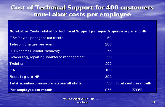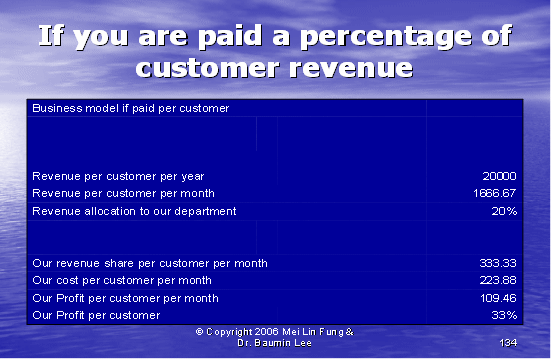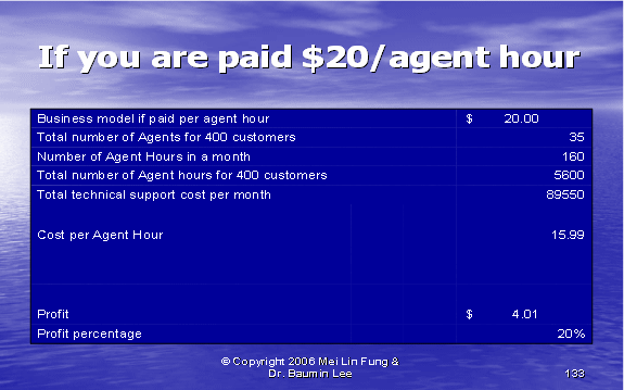 根據(jù)圖表12,我們可以算出第二種方式的利潤(rùn)百分比。如果我們假設(shè)每個(gè)客戶每年的收入是20,000美元,其中分配給呼叫中心部門(mén)的收入是20%。我們每個(gè)客戶每月的收入是333.33美元,每個(gè)客戶月的成本是223.88美元(參見(jiàn)圖表10)。這導(dǎo)致我們來(lái)自每個(gè)客戶每月的利潤(rùn)是109.46美元——這將產(chǎn)生33%的利潤(rùn)率。