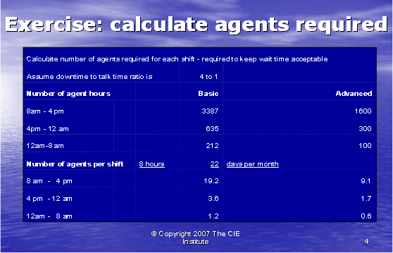 我們現(xiàn)在可以轉(zhuǎn)向下一階段的運(yùn)算,這一運(yùn)算決定我們需要多少座席去支持400個(gè)客戶。由于技術(shù)支持呼叫中心一天24小時(shí),一周7天進(jìn)行運(yùn)營(yíng),以及座席必須三班倒工作,使問(wèn)題更為復(fù)雜。通過(guò)測(cè)量一天當(dāng)中的話務(wù)量,我們發(fā)現(xiàn)80%的電話聚集在上午八點(diǎn)到下午四點(diǎn)的時(shí)間段,15%的電話聚集在下午四點(diǎn)到午夜的時(shí)間段,還有5%則在午夜到上午八點(diǎn)的時(shí)間段。因此,現(xiàn)在我們用該信息去計(jì)算每個(gè)排班中所需要的通話時(shí)長(zhǎng)。表3表明了根據(jù)基礎(chǔ)和高級(jí)支持需要而為我們計(jì)算出的小時(shí)數(shù)。
