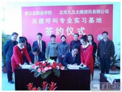 12月18日上午,密云縣職業(yè)學(xué)校與北京九五太維資訊有限公司校企合作共建呼叫專(zhuān)業(yè)實(shí)習(xí)基地簽約儀式在密云縣職業(yè)學(xué)校隆重舉行,市教委職成處處長(zhǎng)李敏,縣委常委副縣長(zhǎng)王春林、副縣長(zhǎng)錢(qián)福生、副縣長(zhǎng)徐芳出席簽約儀式并發(fā)表了講話(huà)。密云縣教委主任李鐘勤,北京九五太維資訊有限公司董事長(zhǎng)汪遠(yuǎn),首席執(zhí)行官李寶民及其培訓(xùn)師團(tuán)隊(duì),密云縣經(jīng)濟(jì)開(kāi)發(fā)區(qū)總公司及部分入?yún)^(qū)呼叫企業(yè)出席了簽約儀式。此次活動(dòng)標(biāo)志著北京呼叫中心產(chǎn)業(yè)基地人才培養(yǎng)工作步入正軌,隨著以密云縣職業(yè)學(xué)校為主體的人才培養(yǎng)模式的確立,長(zhǎng)期困擾呼叫行業(yè)人才短缺的困難有望得到解決。