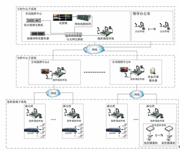 系統(tǒng)采用基于網(wǎng)絡(luò)的分布式控制結(jié)構(gòu),通過公安專網(wǎng)連接市局、縣/區(qū)分局、派出所三級(jí)單位,分為主控中心子系統(tǒng)、分控中心子系統(tǒng)、監(jiān)控前端子系統(tǒng)。結(jié)構(gòu)如下圖: