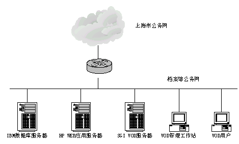 具體系統(tǒng)結(jié)構(gòu)拓?fù)涿枋鋈缦,檔案館公務(wù)網(wǎng)作為上海市公務(wù)網(wǎng)的子網(wǎng),以100Mb/s的速率聯(lián)入上海市公務(wù)網(wǎng),為保證安全可靠,采用加密機提高安全級別;整體系統(tǒng)將部署四臺服務(wù)器:
