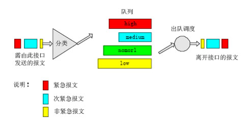 在報(bào)文到達(dá)路由設(shè)備接口后首先對(duì)報(bào)文進(jìn)行分類(lèi),然后按照?qǐng)?bào)文所屬的類(lèi)別讓報(bào)文進(jìn)入所屬隊(duì)列的尾部,在報(bào)文發(fā)送時(shí)按照優(yōu)先級(jí)總是在所有優(yōu)先級(jí)較高的隊(duì)列中的報(bào)文發(fā)送完畢后再發(fā)送低優(yōu)先級(jí)隊(duì)列中的報(bào)文,這樣在每次發(fā)送報(bào)文時(shí)總是將優(yōu)先級(jí)高的報(bào)文先發(fā)出去,保證了屬于較高優(yōu)先級(jí)隊(duì)列的報(bào)文有較低的時(shí)延與丟失率。