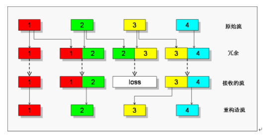 當(dāng)?shù)?個(gè)包在傳輸過(guò)程中丟失時(shí),由于包“3”被冗余編碼到第4個(gè)傳輸包中,在對(duì)端接收到碼流后還可以正常重構(gòu)出包“3”。