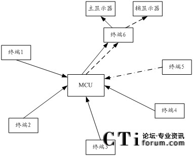 當終端5向MCU發(fā)送輔流而且目的終端是終端6時,MCU將指示終端2、3、4停止發(fā)送視頻流,并通過輔流通道向終端6發(fā)送終端5的圖像,這時終端6的輔顯示器上看到的是終端5的圖像。