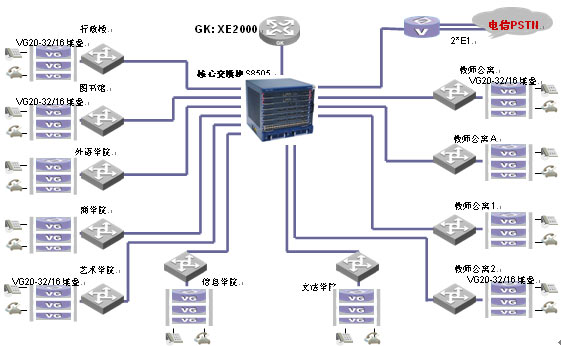 IP語音網(wǎng)采用華為3Com全系列語音視訊產(chǎn)品。為了滿足學校通訊的需求,華為3Com選用Quidway XE2000 IP PBX語音服務器作為核心呼叫控制設備,作為獨立控制的語音服務器,網(wǎng)絡規(guī)劃完®全自主,實現(xiàn)快速部署。采用50余臺ViewPoint®