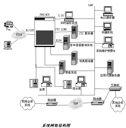 本系統(tǒng)采用E1數字中繼線接入電話網,成為能夠在聲訊臺或機場獨立運行的系統(tǒng)。