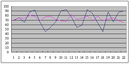 這是兩個(gè)呼叫中心從早上8點(diǎn)開始,一直到晚上6點(diǎn),每隔半個(gè)小時(shí)的服務(wù)水平?梢院芮宄目吹,藍(lán)色這條線,它服務(wù)水平在91到48這中間震蕩,平均服務(wù)水平是73左右,粉紅色這條線,雖然平均服務(wù)水平也是在73左右,但震蕩幅度卻小了很多,服務(wù)水平只在81到68這中間震蕩。