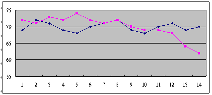 這是兩個(gè)座席員每天的通話利用率,橫軸是這個(gè)月從1號開始到14號,縱軸是通話利用率,藍(lán)色這位的平均通話利用率在70左右,粉紅色這位的平均通話利用率也是在70左右,但上下震蕩的很厲害,月初表現(xiàn)的很好,但從月中開始,通話利用率就一直明顯的下降。