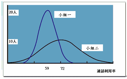 這是兩個(gè)班組的偏差圖,有些移動(dòng)公司開始使用這樣的偏差圖來進(jìn)行管理,這張圖把小組每個(gè)座席員的通話利用率都打了上去,做成一張頻次表,看的方法很容易,橫軸是通話利用率,縱軸是座席員數(shù)目。