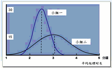 這是兩個(gè)班組的平均處理時(shí)長的頻次表,橫軸是平均處理時(shí)長的時(shí)間,縱軸是座席員數(shù)目,小組二的平均處理時(shí)長的平均數(shù)超過3分鐘,大約是3.1分鐘,有15人平均處理時(shí)長是在這個(gè)平均數(shù),而小組一的平均處理時(shí)長的平均數(shù)是2.5分鐘,有30人平均處理時(shí)長是在這個(gè)平均數(shù)(請看縱軸)。