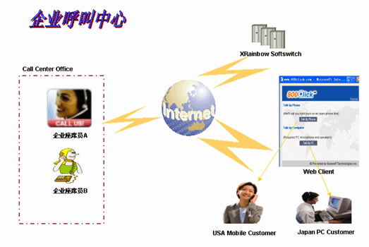 應用上也很簡單,經常上網的客戶PC機上一般都有耳麥,在瀏覽企業(yè)網站時如果對某產品感興趣,可以直接點擊“CALLME”圖標,就可以與企業(yè)的客服通話,不需要支付任何費用;當客戶沒有耳麥時,可以輸入您身邊的手機或座機號碼,5秒鐘后企業(yè)客服電話自動打到客戶電話上,客戶若用手機則需要支付被叫接聽的費用(當然座機是沒有被叫接聽費用的)。