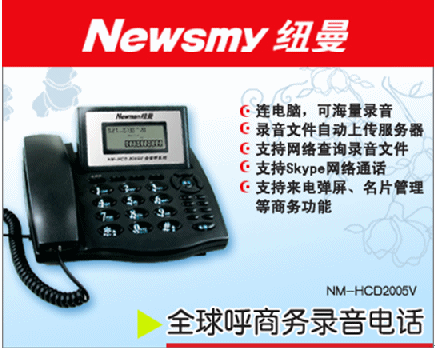 紐曼公司通訊產(chǎn)品負責人介紹,NM-HCD2005V就是一款強大的通訊終端,用USB連接線將其與電腦連接,可實現(xiàn)四大超強增值功能:1、連電腦,可海量錄音;2、錄音文件自動上傳服務器,支持網(wǎng)絡查詢錄音文件;3、支持Skype等VoIP網(wǎng)絡通話;4、支持來電彈屏、名片管理、屏蔽騷擾等商務功能。
