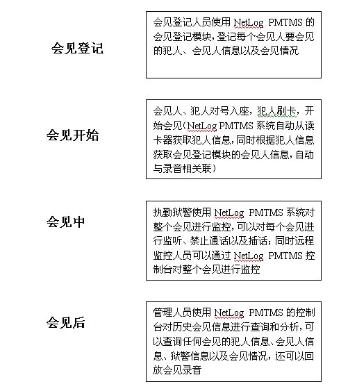 通過NetLog PMTMS系統(tǒng)的改善,整個會見流程變的高效和先進。改善后的會見流程如下: