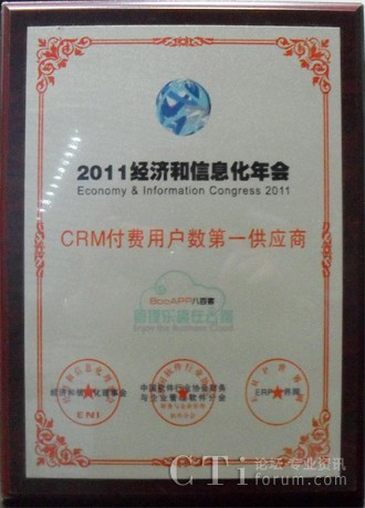 作為全球企業(yè)管理軟件領(lǐng)跑者,八百客參加了此次會(huì)議,并就IT業(yè)戰(zhàn)略性發(fā)展、工業(yè)轉(zhuǎn)型升級(jí)等問題和與會(huì)企業(yè)家進(jìn)行了深入探討,集中、深刻闡釋產(chǎn)業(yè)精髓,洞悉和把握未來發(fā)展方向,尋求最佳的信息化成長模式。年會(huì)期間的招待晚宴穿插各類年度大獎(jiǎng)的頒獎(jiǎng)典禮,讓與會(huì)的政界、學(xué)界、商界等各路貴賓充分交流信息,建立友誼,為達(dá)成長期合作奠定良好的基礎(chǔ);诎税倏驮趪鴥(nèi)CRM領(lǐng)域的優(yōu)秀表現(xiàn),本次年會(huì)特別授予了八百客“CRM付費(fèi)用戶數(shù)第一供應(yīng)商”的大獎(jiǎng)。