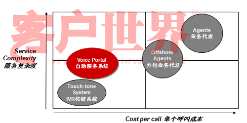 讓我們來看看這張圖。這張圖縱軸是服務(wù)的復(fù)雜度,橫軸是單位呼叫成本,傳統(tǒng)的IVR(觸鍵的語音IVR)和人工服務(wù)相比,服務(wù)的復(fù)雜度可就差多了。而Voice Portal的概念是用比較少的成本做更多的業(yè)務(wù),從成本上講比原來的傳統(tǒng)的IVR可能成本稍微高一點(diǎn)點(diǎn),但是和人工服務(wù)相比,無論是和單位自建呼叫中心座席比,還是和外包呼叫中心座席比,成本都有很大降低,但業(yè)務(wù)復(fù)雜度可以做得比傳統(tǒng)IVR復(fù)雜很多。我們承認(rèn),就提供服務(wù)的內(nèi)容來講,Voice Portal今天仍然不能夠像人工那樣提供那么全面的服務(wù),但是可以涵蓋很多服務(wù)內(nèi)容,在這方面一是因?yàn)榧夹g(shù)先進(jìn)了,另一方面也在于引導(dǎo)。今天我看到越來越多的客戶已經(jīng)開始有意識的推行自助服務(wù)形式。我前幾年去新加坡打出租,發(fā)現(xiàn)在新加坡有很多叫出租的車站,車站上有一個按鍵,按鍵上有一個編碼,說明你在什么位置,當(dāng)你打通出租車客服的電話,你只要告訴這個編碼,他們就自然而然知道你在什么地方,并把要來接你的車車牌號通過語音報(bào)讀方式通知你。今天在中國也開始有這種形式了。昨天我沒有開車,也算是支持北京市每周少開一天車的號召,我打了出租,在和出租司機(jī)聊天的過程中,出租司機(jī)說現(xiàn)在油價(jià)很貴,他們有很強(qiáng)烈的需求不愿意掃馬路,他們也有一個出租車叫車電話,那個呼叫中心大概有上百個坐席,這個公司有一萬六千輛出租車在北京,由他們來進(jìn)行搶答,搶答完之后你可以告訴說這個人在什么地方等,唯一不同的我們在自助化上還沒有做得那么到位,司機(jī)搶到了活還要給客戶打一個電話,不象新加坡完全是自助的,你只要按了那個鍵,系統(tǒng)就知道你在什么地方,當(dāng)尋找到合適的車的時(shí)候,語音報(bào)讀你車牌號就行了。我和說出租車師傅,那你打電話成本不是增加了嗎,他一笑,增加打一個電話的成本怎么也比掃馬路強(qiáng)。大家可以看看呼叫中心多有用,自助服務(wù)能省多少錢。