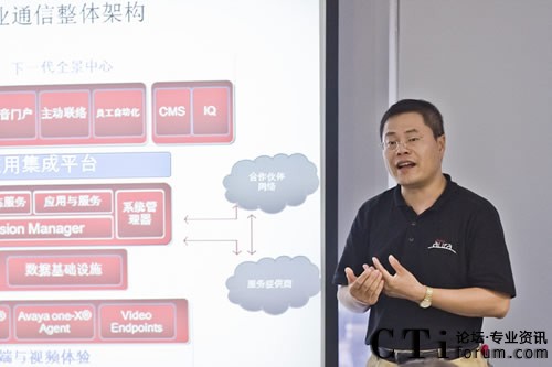 上圖為:Avaya中國區(qū)副總裁李農(nóng)講解Avaya Aura 聯(lián)絡(luò)中心6.2系統(tǒng)架件