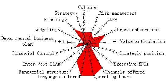 正如技術(shù)(Technology)、人的因素(Human)、環(huán)境(Environment)、和運營管理(Operational Management)一樣,呼叫中心戰(zhàn)略管理在THEM2模型中以一個星狀圖表示。以下是對一個企業(yè)進行呼叫中心THEM2診斷時可能得到的結(jié)果: