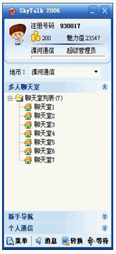 "Skytalk IM(天語(yǔ)通)"輕松實(shí)現(xiàn)互聯(lián)網(wǎng)端用戶和電話用戶之間的跨網(wǎng)絡(luò)私密溝通。用戶可以直接地查找聊友的會(huì)員號(hào)碼,邀請(qǐng)對(duì)方聊天,也可以通過(guò)模糊查詢,查找在線的男性或女性朋友。