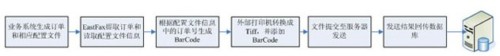 用戶通過EastFax傳真軟件的發(fā)送接口提交含有二維碼編碼請(qǐng)求的傳真文件后,EastFax外部打印機(jī)應(yīng)用程序會(huì)自動(dòng)抓取傳真文件和流水號(hào)碼等配置信息,并根據(jù)二維碼參數(shù)配置自動(dòng)在傳真文件上附加二維碼信息(如訂單號(hào)碼)。然后經(jīng)由EastFax服務(wù)端程序?qū)髡嫖募l(fā)送給客戶。發(fā)送完成后,EastFax傳真系統(tǒng)自動(dòng)將發(fā)送結(jié)果寫入用戶的數(shù)據(jù)庫(kù)中。