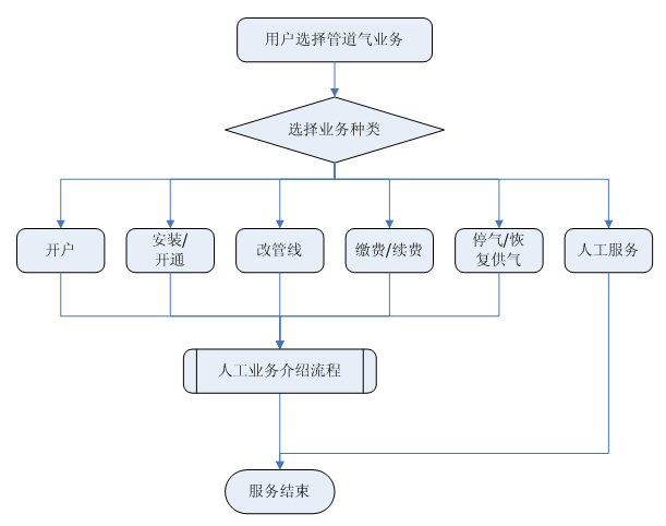 業(yè)務(wù)咨詢:用戶通過人工、自動語音等方式咨詢有關(guān)政策法規(guī)、資費標(biāo)準(zhǔn)、用氣常識、報裝方法等,系統(tǒng)以語音、傳真、Email、短消息等方式回復(fù)客戶。