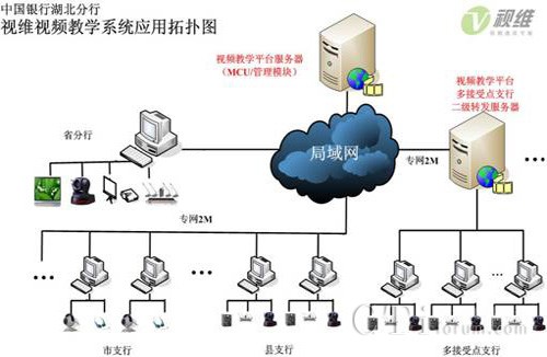中國銀行湖北分行的視頻教學系統(tǒng)由服務(wù)器端和客戶端組成,服務(wù)器端軟件部署在省分行中心機房,配置2臺服務(wù)器,對于接受點超過5個的分支機構(gòu)配置二級轉(zhuǎn)發(fā)服務(wù)器,共支持全省各支行及支行內(nèi)多個客戶端同時在線,負責所有培訓的召集、音視頻交互、加密等工作,各支行通過WEB方式即可實現(xiàn)客戶端軟件的自動安裝與升級,輕松實現(xiàn)實現(xiàn)省分行以及各支行共77余個接受點的高清音視頻視頻教學。同時為中國銀行湖北分行的視頻教學系統(tǒng)配置異構(gòu)兼容模塊,支持與其他視頻會議及軟、硬件視頻教學系統(tǒng)無縫融合,避免重復投資造成的浪費。網(wǎng)絡(luò)拓撲圖如下: