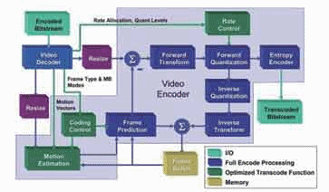 過去幾年來,業(yè)界針對轉碼工作提出了幾種不同的方法,可提高處理與存儲器資源的使用效率。大多數(shù)這種方案都建立在這樣一種認識基礎之上,即我們能通過更先進的技術對初始編碼過程中創(chuàng)建的量子化和頻率域信息進行修改,更好地加以利用,摒棄其中無用的東西,而不必簡單地對原始視頻內容進行重構。