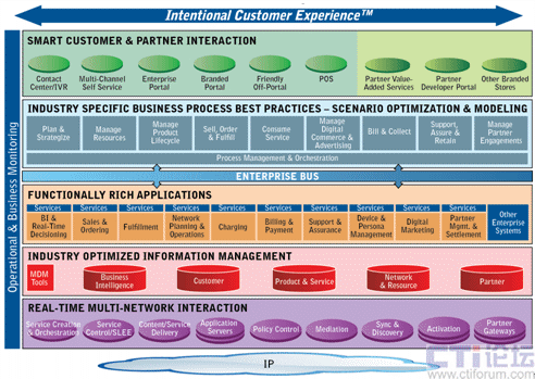 其次,CES改變了現(xiàn)有的業(yè)務應用層將功能和流程融合在一起的模式,對流程和功能進行了分離。實際上,應用功能和流程結合得越緊密,系統(tǒng)的適應性就會越差,對新業(yè)務和新產(chǎn)品的響應時間就越長,CES將業(yè)務應用層分為流程層和應用功能層,流程和功能的分離極大的提高了系統(tǒng)靈活性,降低了系統(tǒng)集成的復雜程度和成本開銷,滿足了新業(yè)務和新產(chǎn)品快速上市的要求。在流程層,運營商不僅可以選擇采用Amdocs在25年服務經(jīng)驗的基礎上總結的業(yè)界最佳實踐的業(yè)務流程,也可以選擇采用企業(yè)現(xiàn)有的業(yè)務流程;在應用功能層,Amdocs全系列軟件產(chǎn)品將更加模塊化,運營商可以選擇Amdocs全系列軟件產(chǎn)品,也可以選擇其中的個別或部分產(chǎn)品,這種高度模塊化的產(chǎn)品將以更快的速度集成到運營商已有的IT框架中。