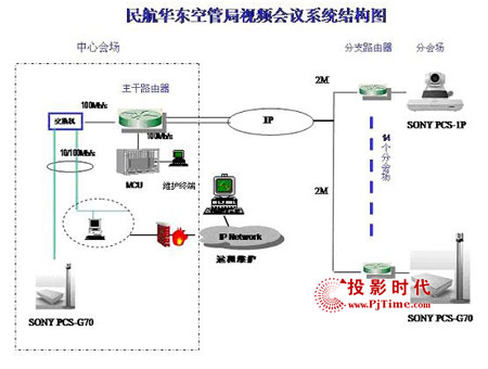 為了建成“具有華東特色,符合總局要求”的視頻會(huì)議系統(tǒng),空管局領(lǐng)導(dǎo)經(jīng)過嚴(yán)格的考察和甄選后,最后采用了Sony的視頻會(huì)議系統(tǒng)解決方案,包括5臺(tái)PCS-G70和10臺(tái)PCS-1P。整個(gè)項(xiàng)目運(yùn)行在民航數(shù)據(jù)網(wǎng)(ATM網(wǎng))的環(huán)境下,共有24個(gè)節(jié)點(diǎn),設(shè)備分布呈星型結(jié)構(gòu)。