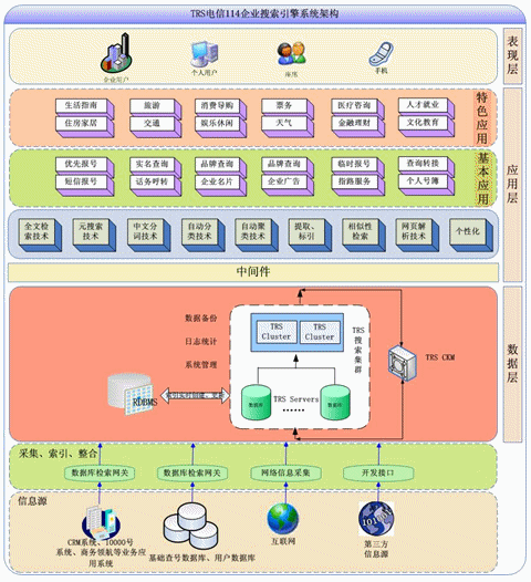 TRS公司結(jié)合電信行業(yè)114業(yè)務(wù)應(yīng)用需求,依托自身企業(yè)搜索引擎產(chǎn)品和中文信息處理技術(shù),推出的的電信114企業(yè)搜索引擎解決方案,能夠全面整合索引搜索電信114業(yè)務(wù)應(yīng)用的信息內(nèi)容,并向用戶提供高效的、準(zhǔn)確的、安全的、個性化的搜索體驗(yàn)。其框架圖如下: