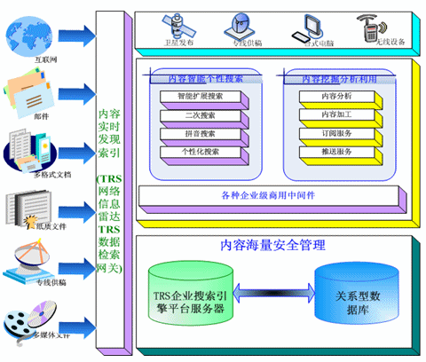 TRS公司推出的企業(yè)搜索引擎解決方案,利用TRS公司多年來自主開發(fā)的TRS Database Server作為企業(yè)搜索引擎服務(wù)的平臺?梢詫㈦娦牌髽I(yè)內(nèi)外部多種格式、多種介質(zhì)形態(tài)、多種存儲方式的內(nèi)容信息,以實(shí)時的方式將這些信息進(jìn)行索引。并且在索引的過程中力求能夠做到準(zhǔn)確,并配合以相關(guān)智能語言技術(shù)做信息的去重、自動標(biāo)引等能力。其框架如圖:
