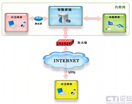 配置應(yīng)急座席的必要條件之一是網(wǎng)絡(luò)環(huán)境,要求應(yīng)急座席家庭計(jì)算機(jī)能夠連接到Internet或能夠直接訪問客服系統(tǒng)內(nèi)部網(wǎng)絡(luò),位于客服網(wǎng)絡(luò)防火墻之外需要通過相應(yīng)的技術(shù)連接到系統(tǒng),實(shí)現(xiàn)對系統(tǒng)的訪問。