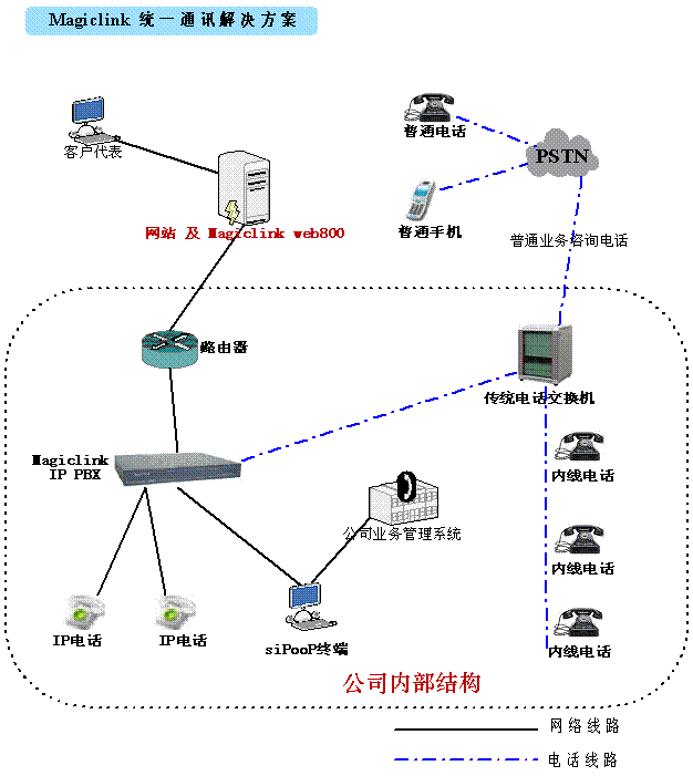 Magiclink統(tǒng)一通訊解決方案利用我公司的全線產(chǎn)品,將企業(yè)的:網(wǎng)站、內(nèi)部電話、呼叫中心、客戶管理系統(tǒng)完整的整合在一起。通過這種整合起到了:降低成本、增加營銷手段、提升資源利用率的特點。
