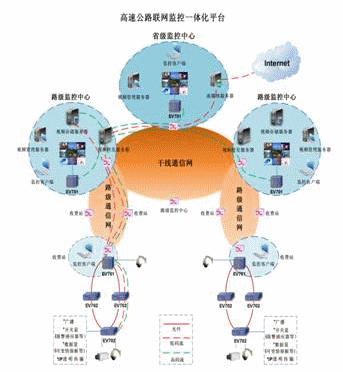 采用H.264編碼標(biāo)準(zhǔn)的EV702外場綜合接入設(shè)備,將原來外場分散的攝像頭、快球、云臺、可變情報板、報警感應(yīng)器等設(shè)備融為一體,同時也支持MPEG編碼標(biāo)準(zhǔn)的視音頻接入。EV702配備光纖通信板卡,不需要光端機(jī),可以直接連接光纖,進(jìn)行遠(yuǎn)距離。通過EV702連接成環(huán),并且具有自愈功能。可進(jìn)行集中式(路級監(jiān)控中心)、分布式(各級監(jiān)控中心)存儲。路級中心、區(qū)域中心、省級中心分布式多級監(jiān)控,由省中心統(tǒng)一設(shè)定權(quán)限,進(jìn)行集中管理。